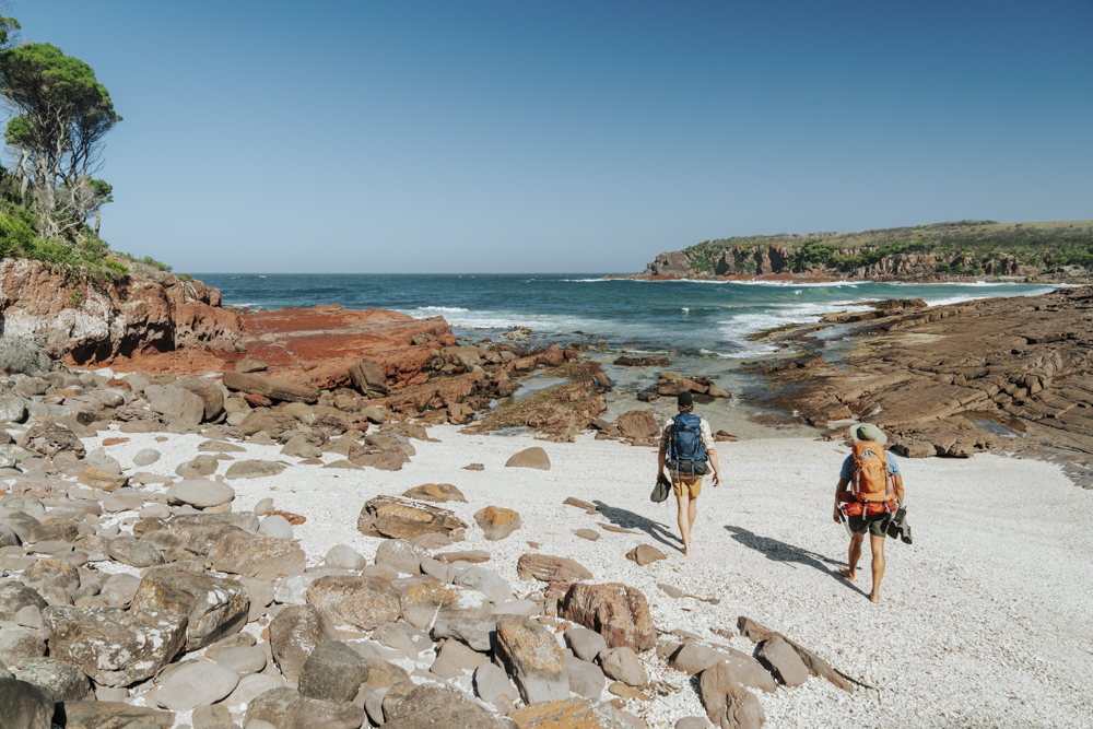 Enjoy ample opportunities for photography, slow conversation, and a deep connection with the country we walk through.  Marvel at the rich forests of Stringybark, Eucalyptus, and Giant Honey Myrtle. Watch dolphins cruising the waves and circling White-Bellied Sea Eagles. Soak in the stunning views of the Tasman Sea.